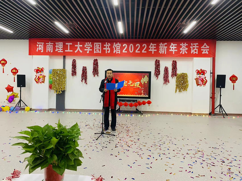 金虎腾跃昌新运,啸震山河大步来,人寿年丰歌盛世,山欢水笑庆新春。近日,图书馆2022年新年茶话会在新馆308隆重举行。党总支书记张红霞,副馆长李天姿、王秋梅、李明理与全体职工欢聚一堂,共话新年。副校长朱建光应邀出席茶话会并致辞,图书馆多位荣休职工受邀参加茶话会并参演节目。