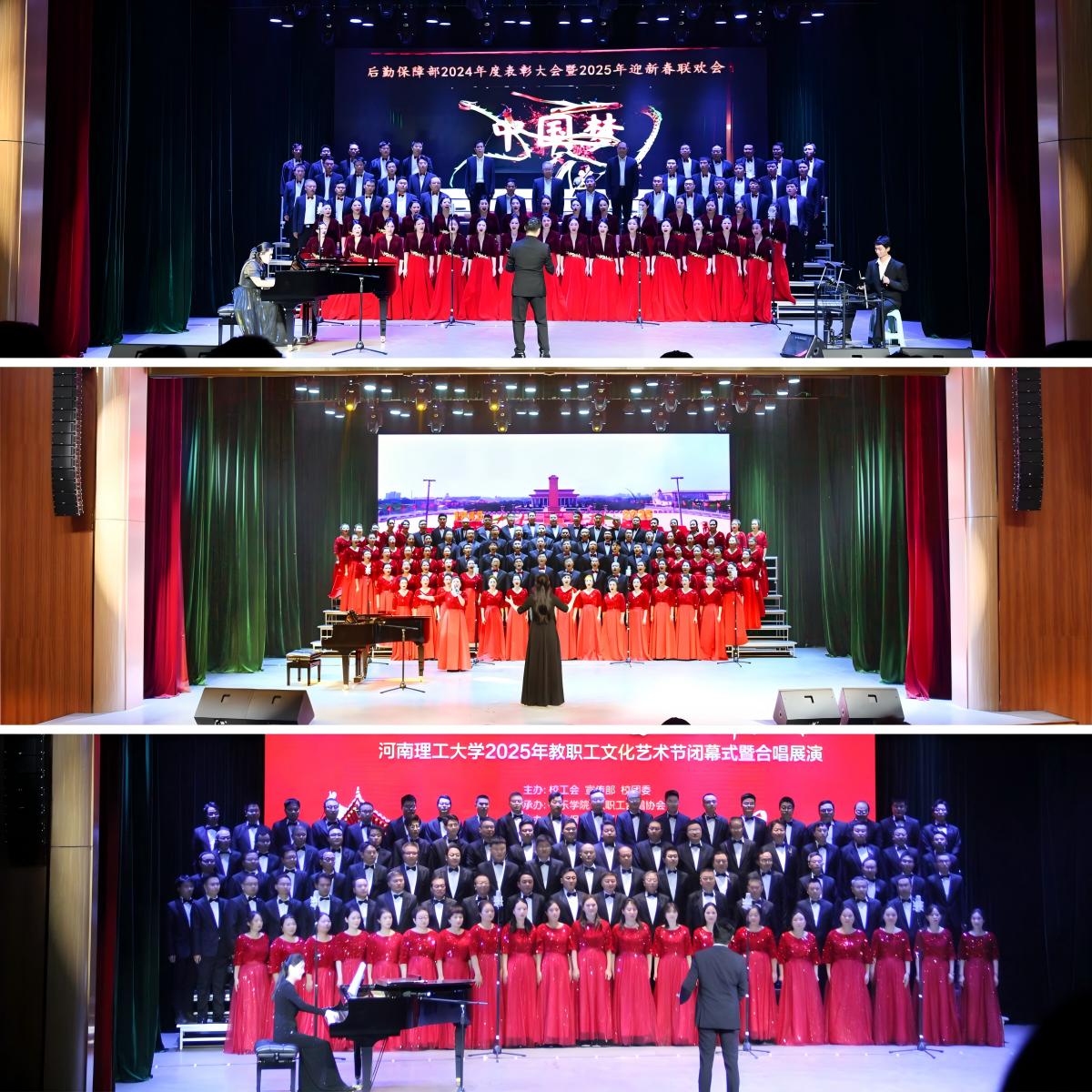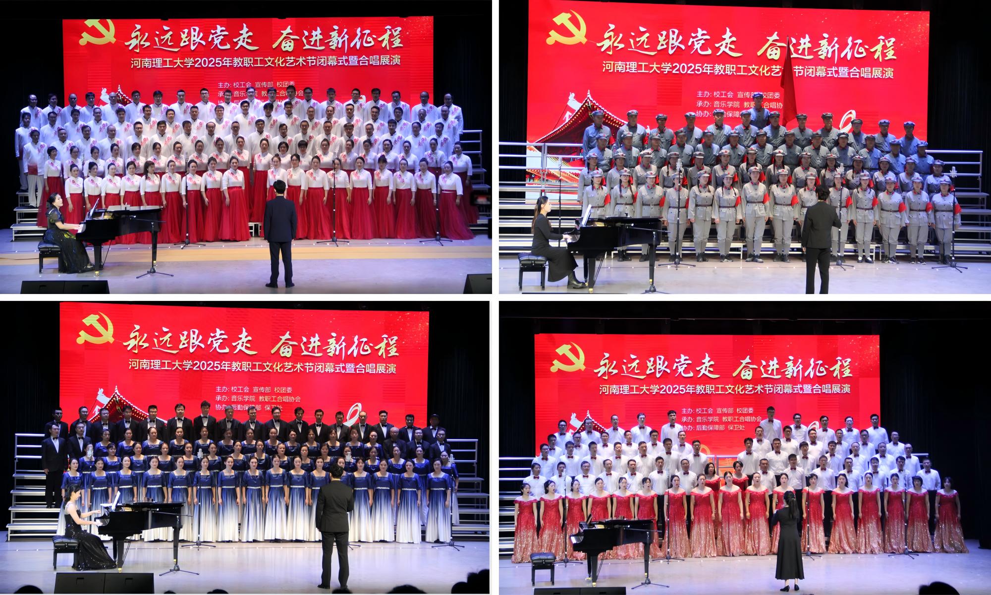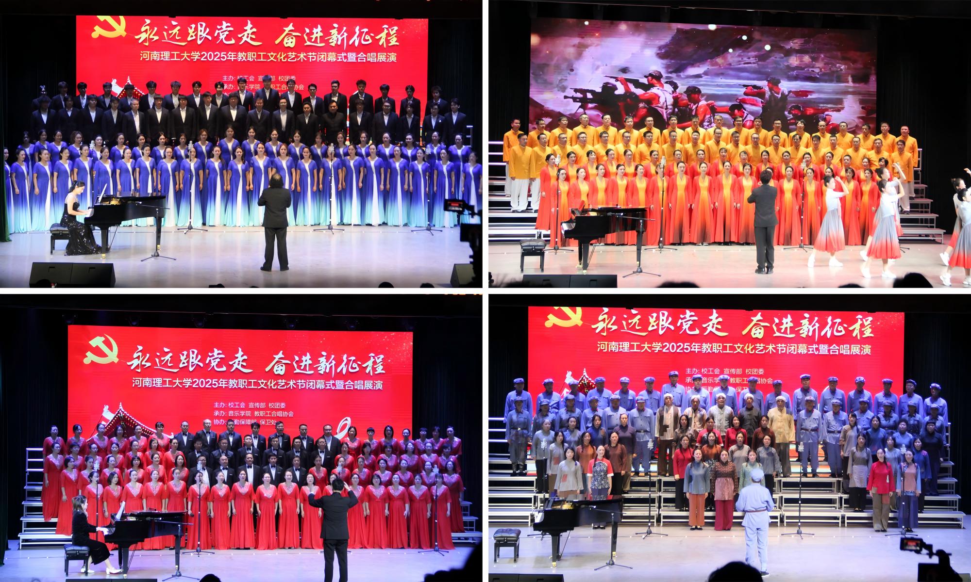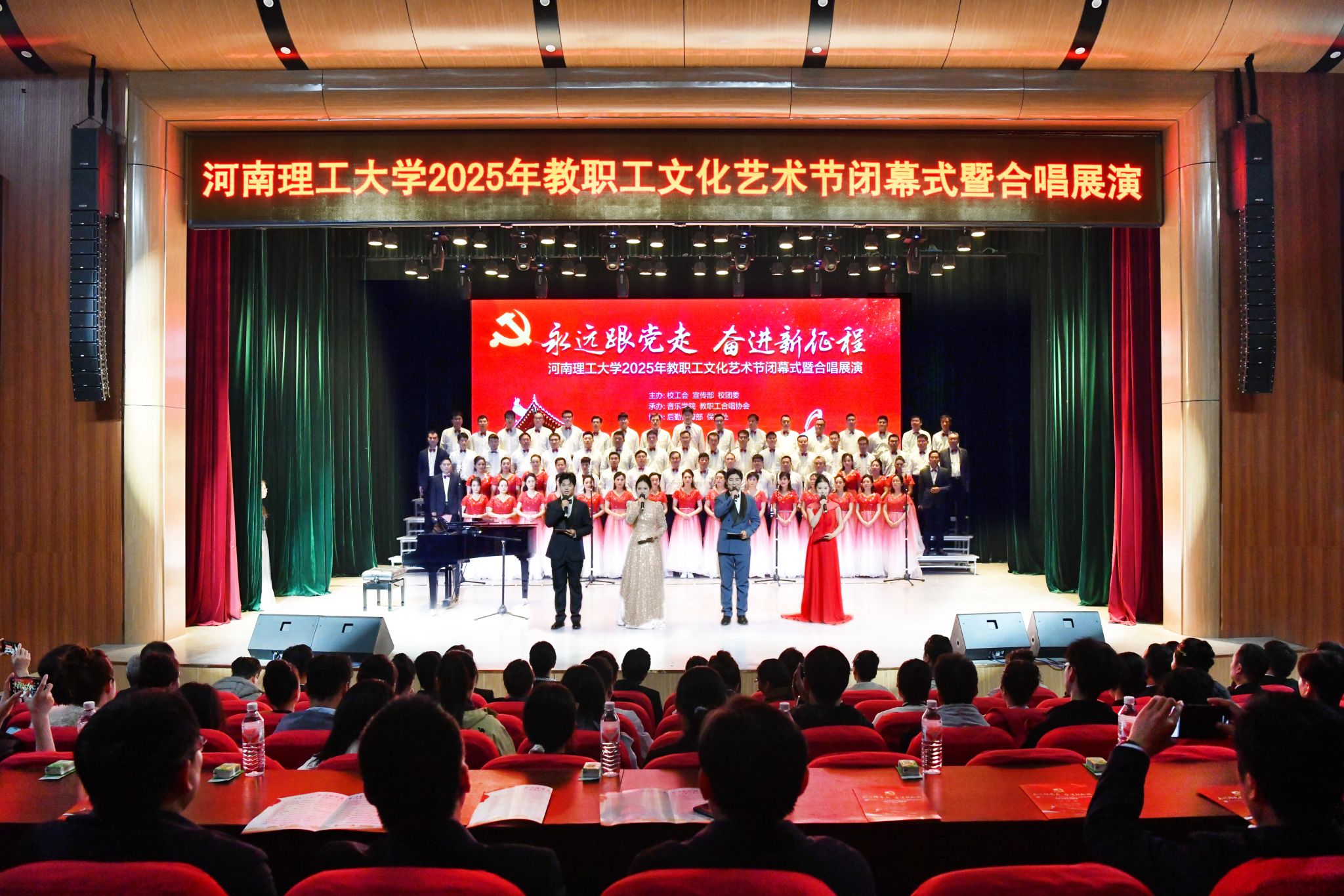 为庆祝中华全国总工会和河南省总工会成立100周年,纪念中国人民抗日战争胜利80周年,大力弘扬劳模精神、劳动精神、工匠精神,11月4日下午,由校工会、党委宣传部、校团委主办,音乐学院、教职工合唱协会承办的“永远跟党走 奋进新征程”教职工合唱展演在南校区小礼堂举行。校长赵同谦、校党委副书记白鑫刚、校纪委书记赵晓军、副校长边亚东出席活动并为获奖单位颁奖,校工会副主席欧阳文峰、副主席兼女工委主任刘小梅以及校办、宣传部、统战部、团委、音乐学院等部门和单位负责人到场观看。