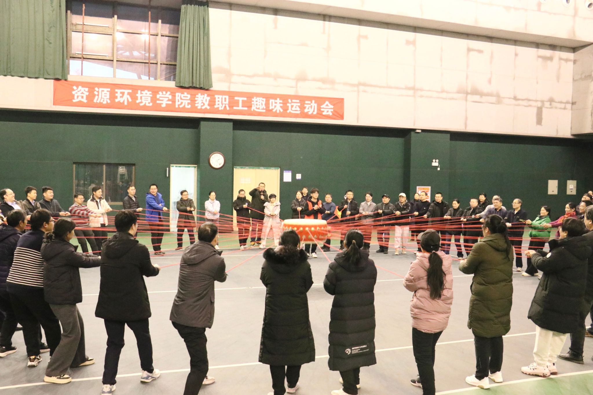 为丰富教职工的体育文化生活,展现教职工积极向上、团结协作的精神面貌。2024 年 12月24日下午,资环学院工会组织教职工在体育馆举行趣味运动会。本次运动会精心设置了“龙腾盛世”“旱地冰壶”“超级战鼓”等极富趣味性与挑战性的项目,还特别安排了激动人心的 50 人战鼓终极挑战,吸引了众多教职工踊跃参与,现场气氛热烈非凡。