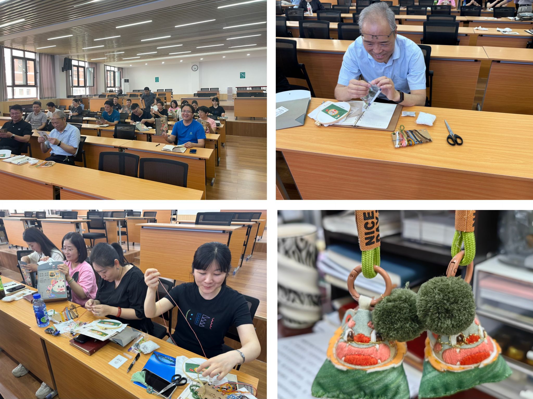 活动伊始,活动主持人先分发给大家制作香囊的材料,然后给大家讲解演示如何制作香囊。现场气氛活跃,老师们情绪高涨。香囊里面所存放的中草药大多具有清香的味道,可以驱蚊虫、辟秽、防病,挂在包上更能增添几分意趣。看着自己亲手制作的香囊,每位教职工的脸上都洋溢着笑脸,充满了成就感。