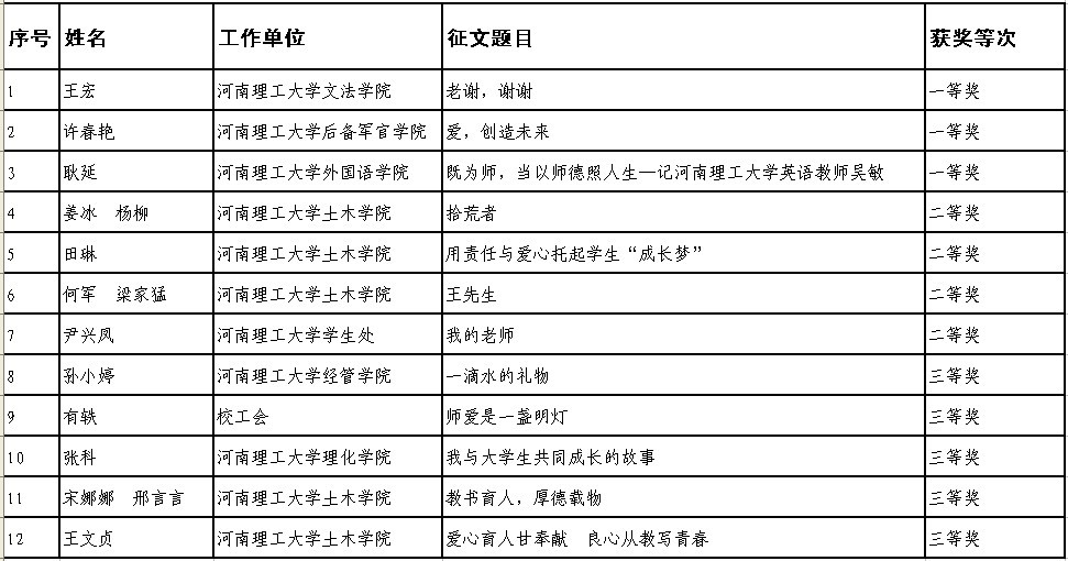 近日,省教育厅印发《关于公布“学习张伟,践行焦裕禄精神”师德主题案例评选和征文演讲比赛结果的通知》(教师〔2014〕779号),我校推荐上报的师德微故事征文喜获佳绩,共有12篇文章分获一、二、三等奖,学校获得优秀组织奖。