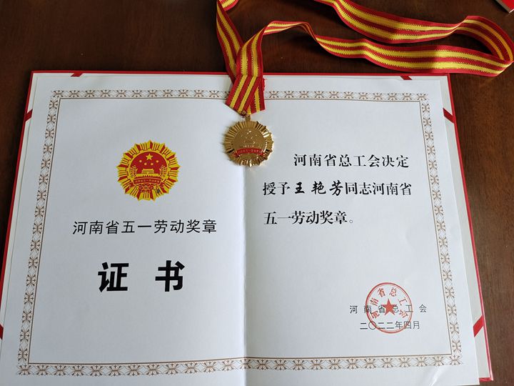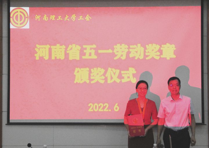 ??6月24日下午,校工会在力行楼一楼会议室举行颁奖仪式,校工会主席郭相春为获得 2022年度河南省五一劳动奖章的我校数信学院教师王艳芳颁奖。颁奖仪式由校工会副主席田留轩主持。
