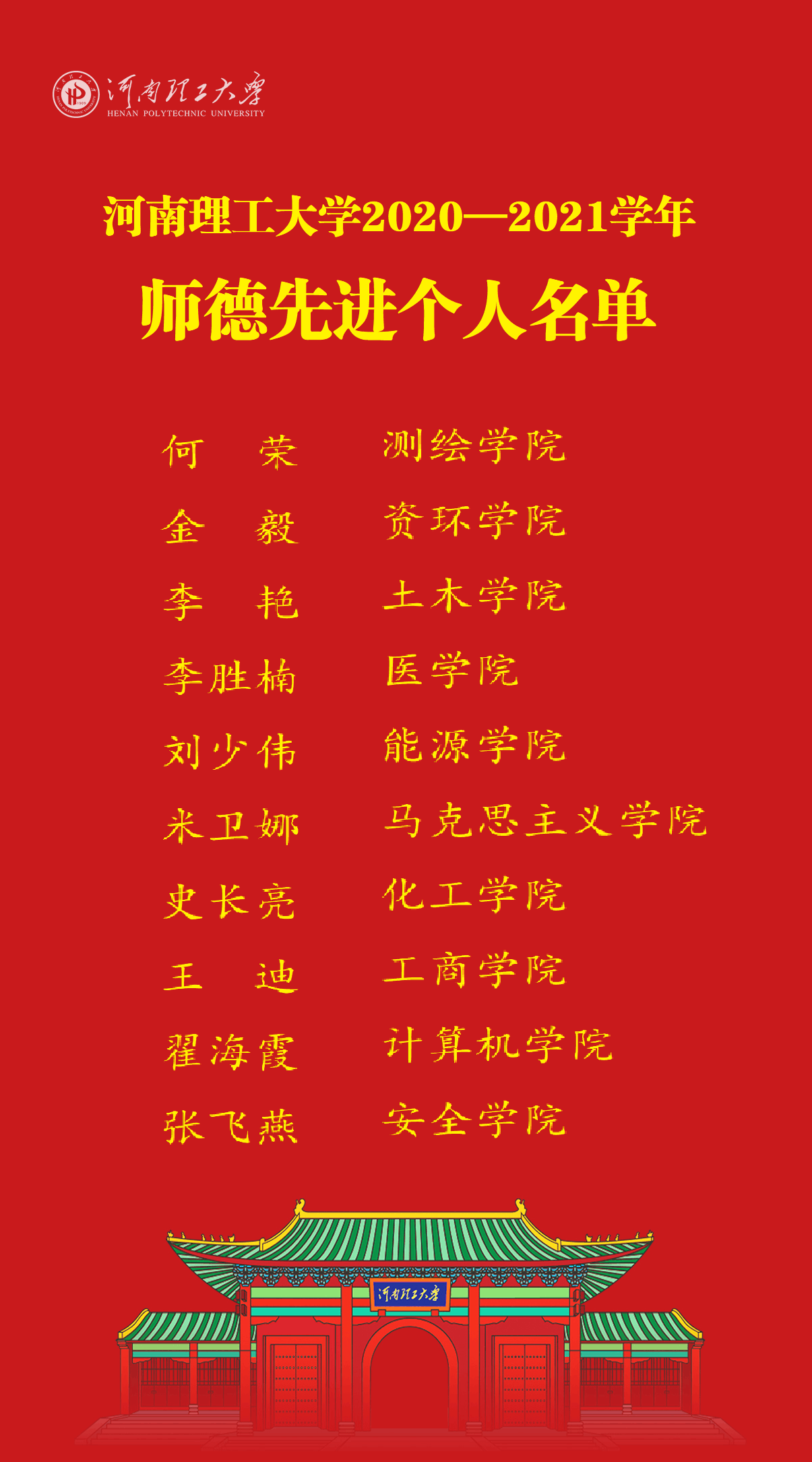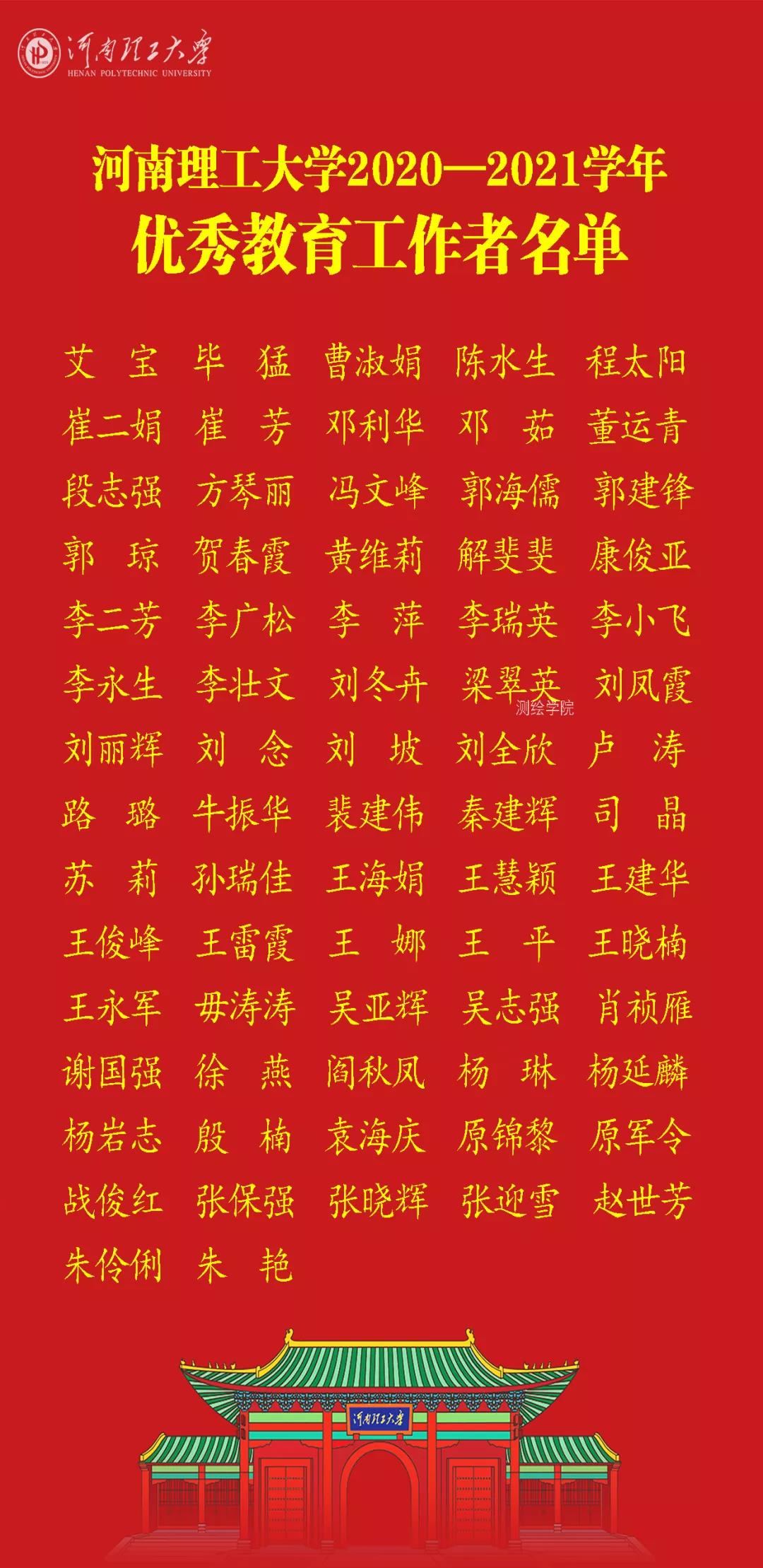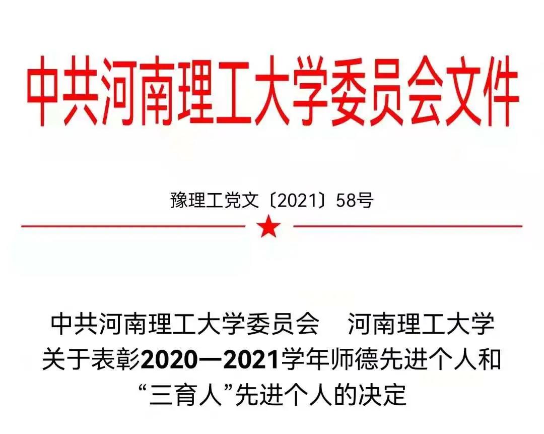 ??他坚守以德立学、以德施教理念,秉持情系教坛、严谨治学精神,始终将“立德育人”作为工作出发点,贯穿于工作全过程。先后荣获河南省“教学标兵”、河南理工大学“二级元培名师”“示范教师”“优秀党员”“优秀教师”“精神文明先进个人”和焦作市“优秀教师”等称号。