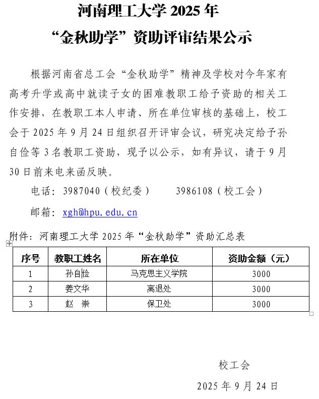 河南理工大学2025年“金秋助学”资助评审结果公示