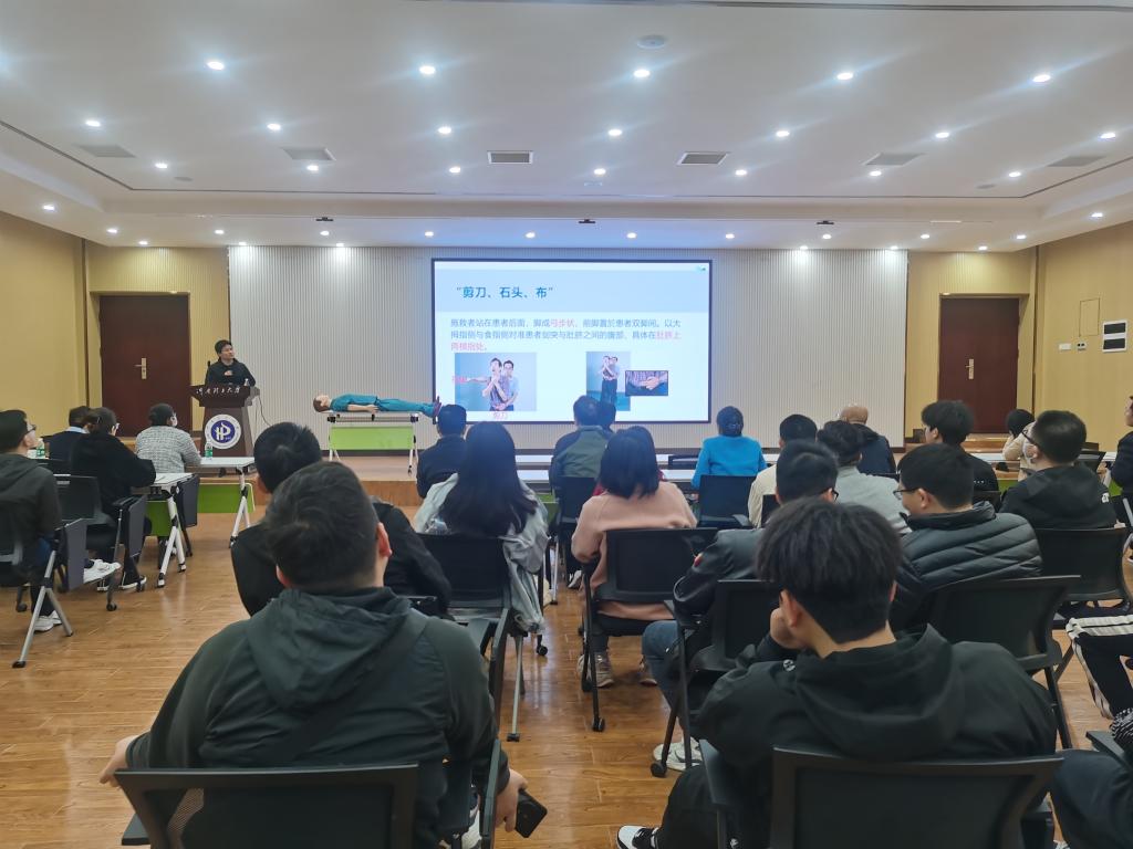 首先,校医院保健科主任余波给大家详细讲解了异物窒息的表现和急救方法,如何判断病人是否需要进行心肺复苏,心肺复苏的外界实施条件,怎样进行心肺复苏以及体外除颤仪的使用方法。接着,两位医生利用“模拟人”和AED除颤器对心肺复苏的全过程进行现场演示,让大家准确领悟了“胸外心脏按压”“气道畅通”“人工呼吸”“体外自动除颤”等实际开展急救时的操作要点。与会师生积极主动上前进行实际操作训练,细致领会每一步的操作标准与要领。