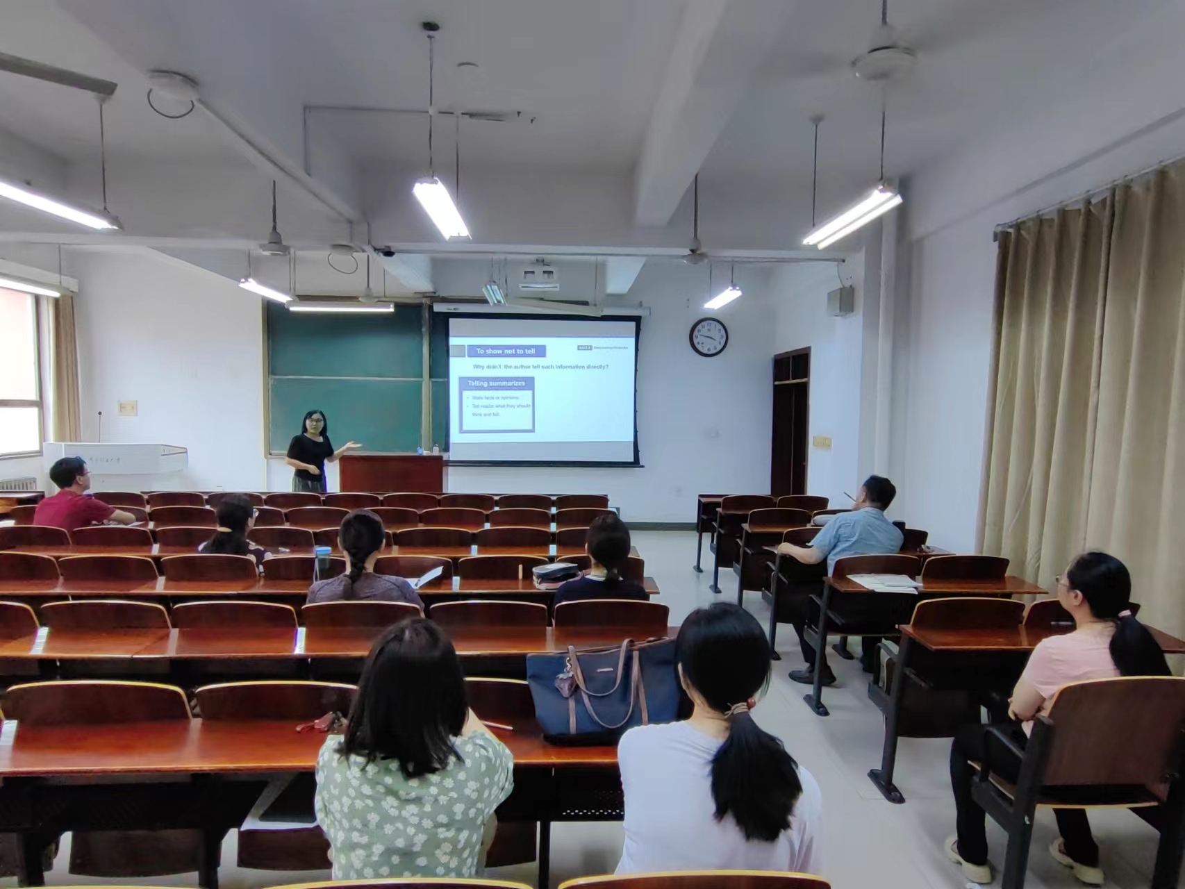 梁萍以新版高阶大学英语综合2第二单元Task B为示范内容进行教学展示,其授课内容丰富多彩,教学设计完整规范,教学组织井然有序,并以其流利的口语,稳重大方的台风展示了其教学魅力。展示结束后,李惠敏、郑忠耀、冉玉体、余阳、郜莉等老师纷纷发表建议:一是尽可能多的运用多种现代化教学方法、手段,激发学生的学习兴趣;二是根据实际情况确定教学内容适宜的难易程度,合理安排讲授进度;三是教姿、教态方面需自然、大方得体,合理得当地运用教学手势;四是优化教学课件,突出教学重难点,最大程度集中学生的注意力,实现课堂的有效教学。梁萍及参与教学观摩的教师纷纷表示受益匪浅。