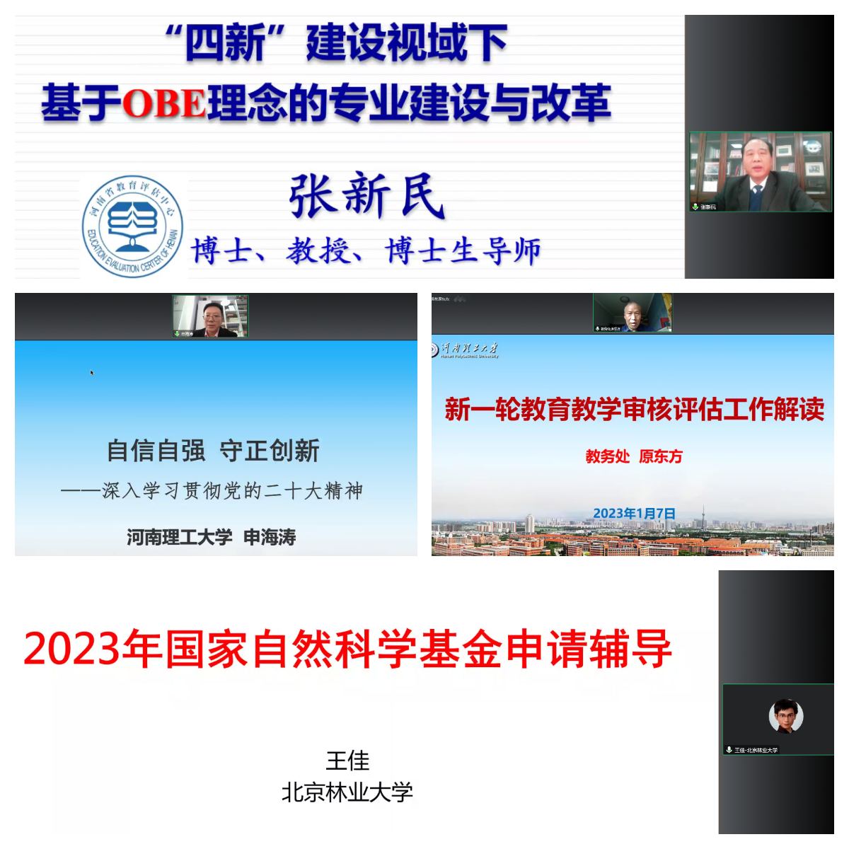 培训为期两天,共开展4场专题讲座和报告。期间,校宣讲团专家申海涛教授作题为《自信自强 守正创新——深入学习贯彻党的二十大精神》的报告,以深入浅出、角度新颖的讲述方式,全面系统地阐述了习近平新时代中国特色社会主义思想、全面建成社会主义现代化强国的深刻内涵,详细介绍了新时代十年的伟大成就、马克思主义中国化时代化新境界、新时代新征程中国共产党的使命任务和全方位治国理政部署四个方面,对我院全体教职工深刻领悟党的二十大报告的核心要义和精神实质,加强师德师风建设和廉洁教育,凝聚思想共识,强化使命担当有着重要启发作用;教务处副处长原东方作题为《本科教育教学审核评估工作解读》的报告,从新一轮审核评估分类、评估流程评估新变化等方面进行了阐述,详细介绍了校内外综合评价、院校间常模比较和做好自评自建工作的内容,对我院本科教育教学审核评估工作具有深刻指导意义;北京林业大学林学院副院长、国家自然科学基金优青/面青地项目的会评和函评专家王佳教授作题为《2023年国家自然科学基金申请辅导》的报告,从国家自然科学基金介绍、地理科学学科介绍、2022年申请情况及问题、通讯评审与优秀案例等方面为大家讲解国家自然科学基金申请的要点,并就需要注意的事项和常见问题进行详细解读,使我院教师对国家自然科学基金的申报思路、申请书的撰写和技巧等有了进一步的认识和思考;机械学院院长张新民教授作题为《“四新”建设视域下基于OBE理念的专业建设与改革》的报告,以世界和中国的高等教育质量提升为主线,解读了“四新”建设和OBE理念的内涵,并从OBE理念如何用于专业建设和质量保证体系的构建方面进行了详细讲解。集中培训结束后,全院教职工以系、室为单位开展《OBE理念视域下的教学质量监控与持续改进》和《考虑深度融合课程思政的教学创新比赛备赛》两个专题的学习与研讨。