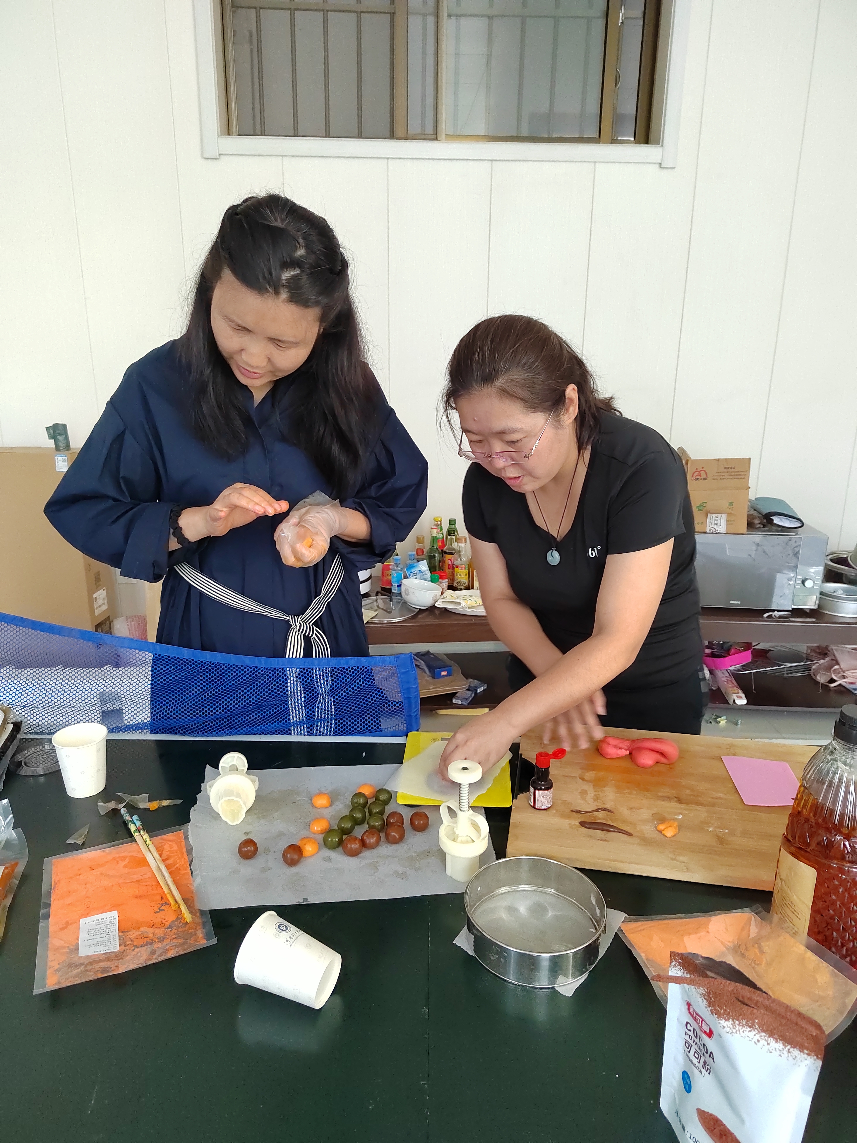 活动开始后,大家看到做月饼各种馅料、模具等都迫不及待的立刻动起手来。大家围在一起互相学习、切磋技艺。很快一盘月饼就完成了。有圆形的,有花生形状,还有兔子形状。小小的月饼,承载着厚重的中华传统,诉说着古老的民俗风情,为节日更增添了一份浓浓的祥和之气。