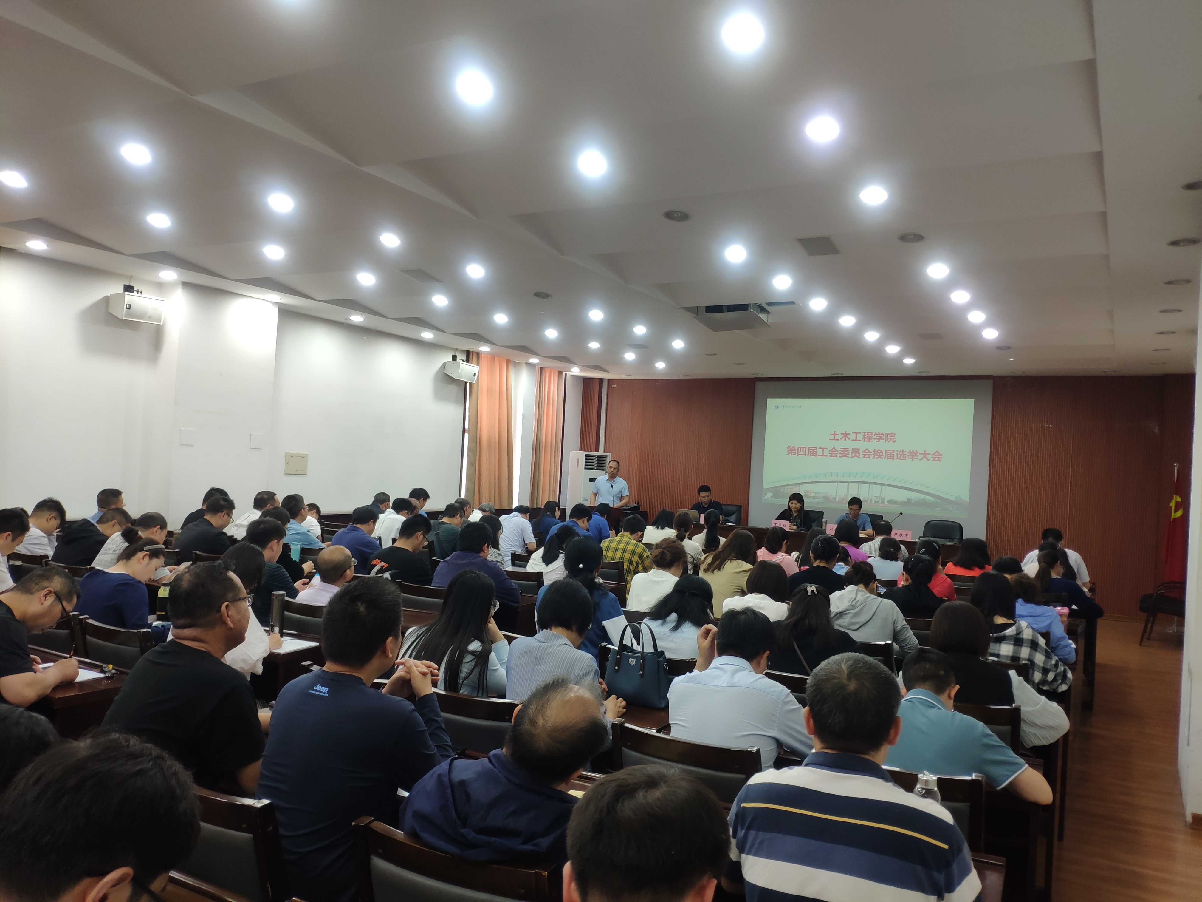 5月18日下午3点,土木学院在一楼学术报告厅举行了第四届工会委员会换届选举大会,学院全体工会会员参加了此次大会,会议由工会副主席朱运华主持。